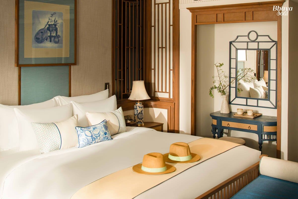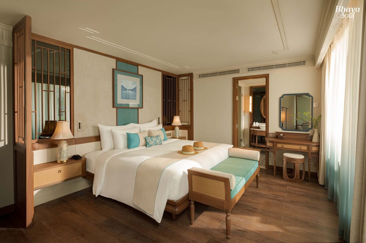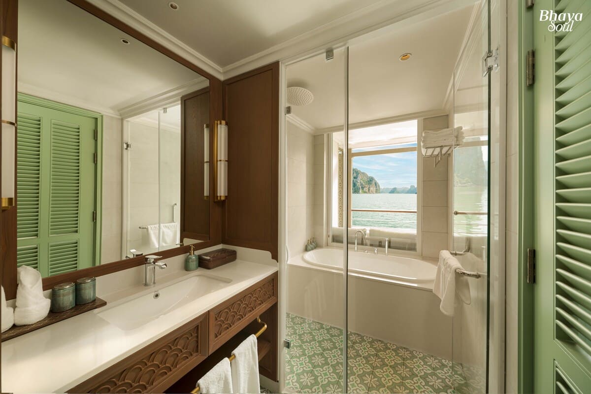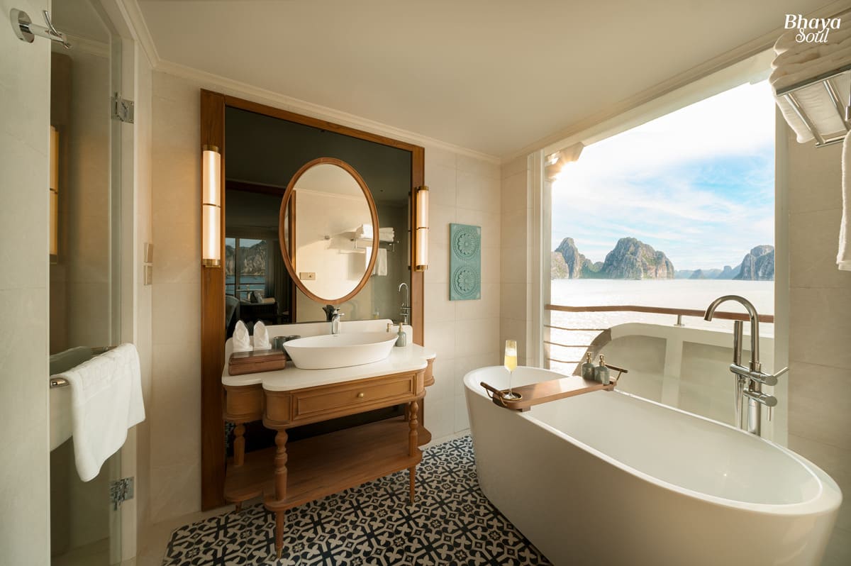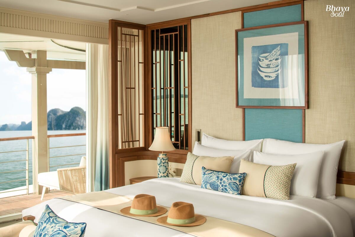 With only 20 spacious cabins ranging from 30m² to 80m², Bhaya Soul Cruise ensures ultimate privacy and comfort for every guest. The design is inspired by traditional Vietnamese ceramics, highlighted by a signature blue tone symbolizing the harmony between land, sea, and nature in Halong Bay. Each cabin is thoughtfully equipped with modern amenities such as air conditioning, TV, minibar, and Wi-Fi, delivering a perfect balance between sustainability and luxury living.