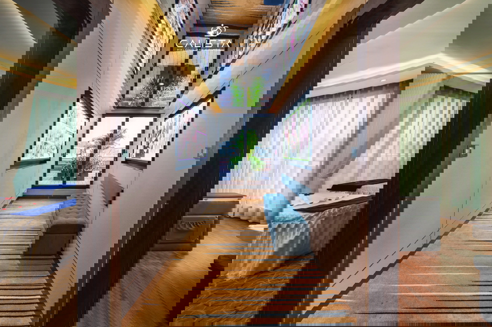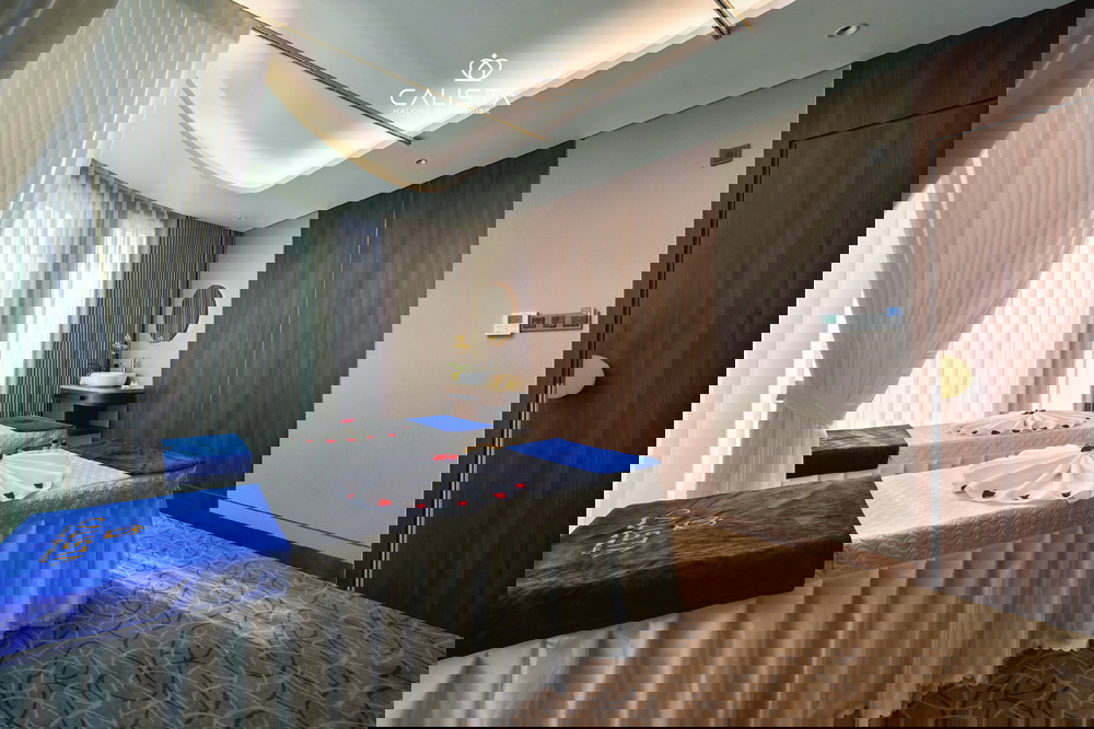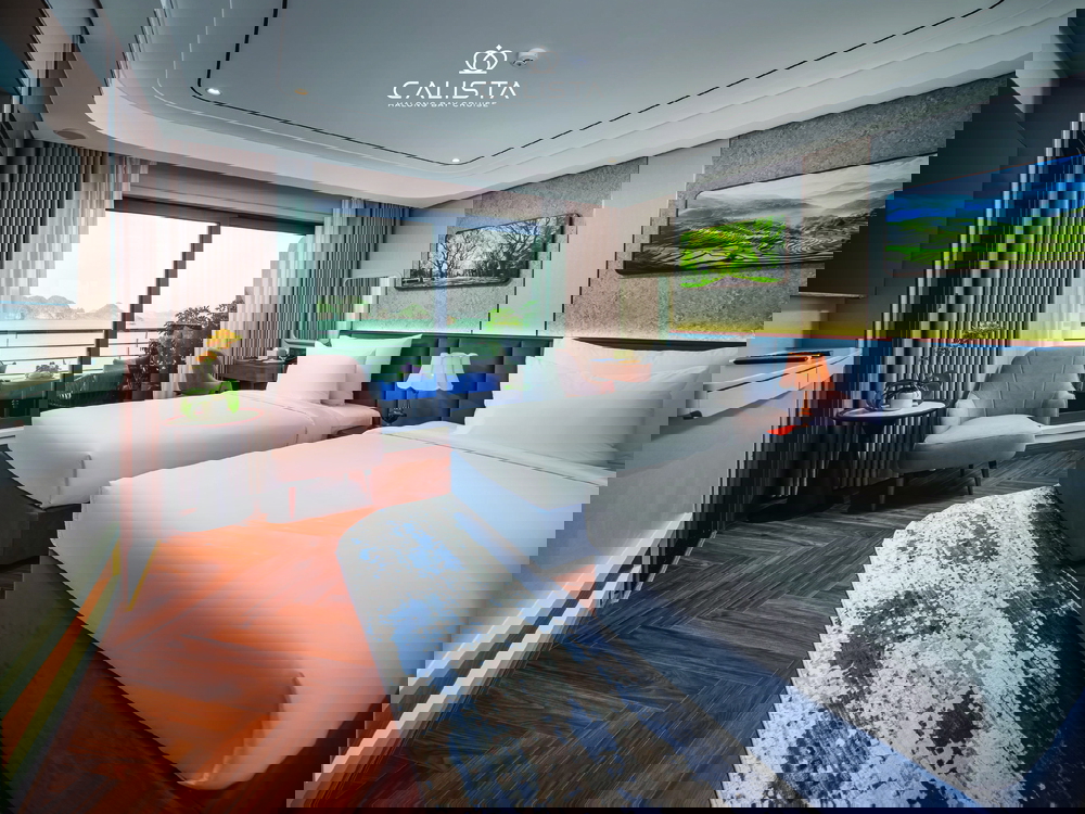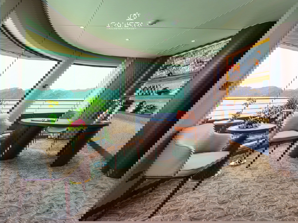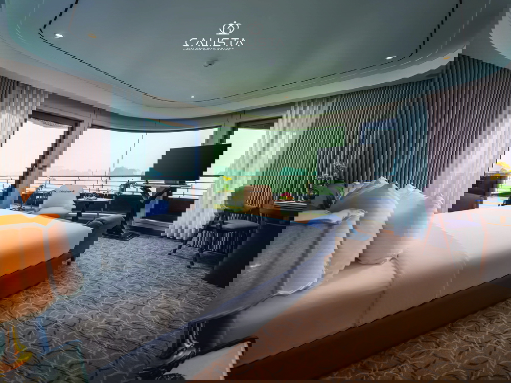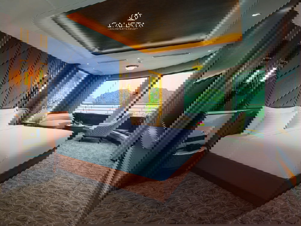 Calista Cruise features 38 spacious cabins, categorized into 6 room types and spread across the first three decks. Each cabin ranges from 30m² to 126m² and is fully equipped with modern amenities to ensure maximum comfort. Guests can relax on plush beds or enjoy the stunning bay views from private balconies, creating a perfect blend of luxury and tranquility.