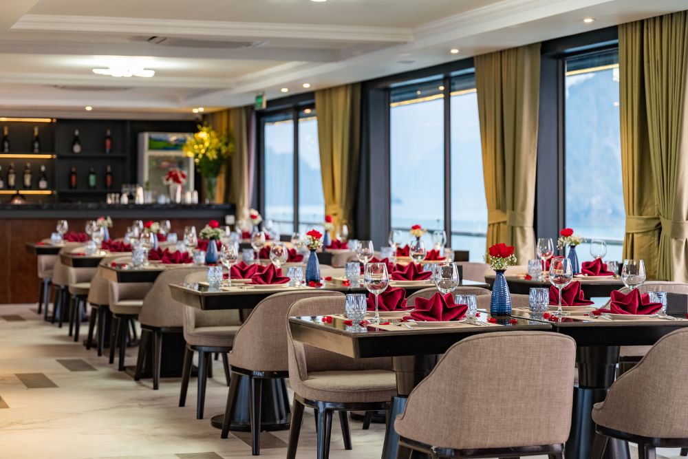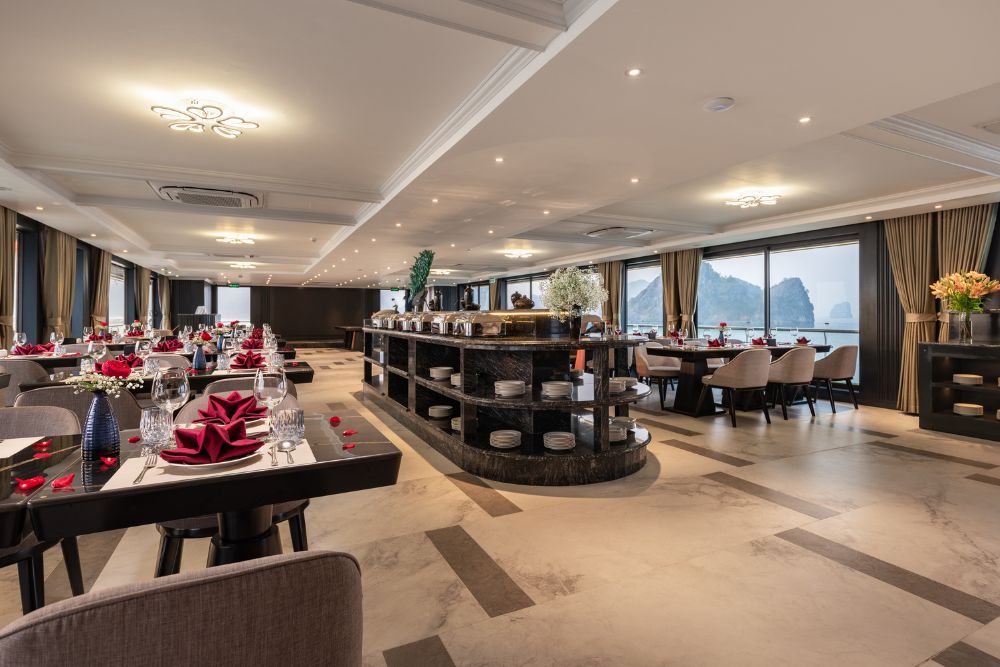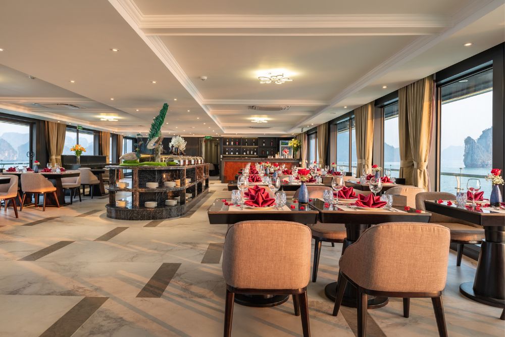 Doria Cruise also offers a diverse culinary experience, combining local Vietnamese flavors with international cuisine. Guests can request customized meals such as vegan, non-seafood, or gluten-free options, making it suitable for all dietary preferences.