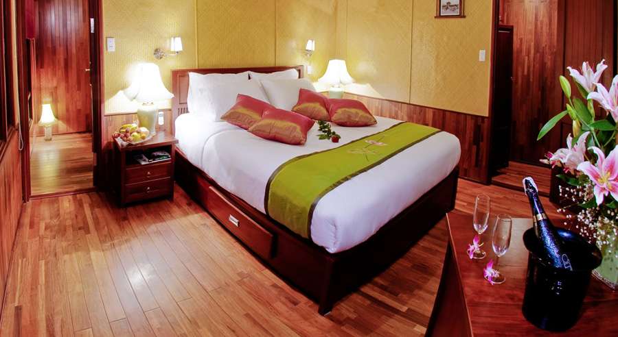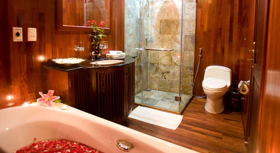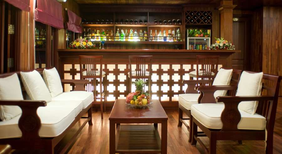 The cruise features 4 Deluxe cabins and 1 spacious Suite, ranging from 19 to 30 sqm. Each cabin is elegantly designed with high-quality wooden interiors and equipped with modern amenities, including air conditioning and private bathrooms with both standing showers and bathtubs—delivering one of the most comfortable onboard experiences among small cruises in Halong Bay.