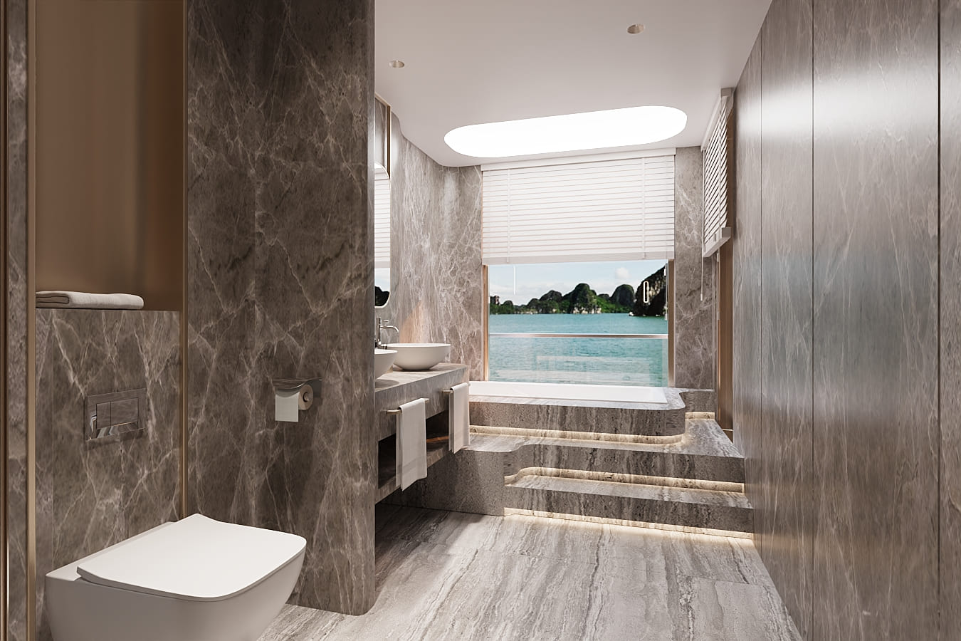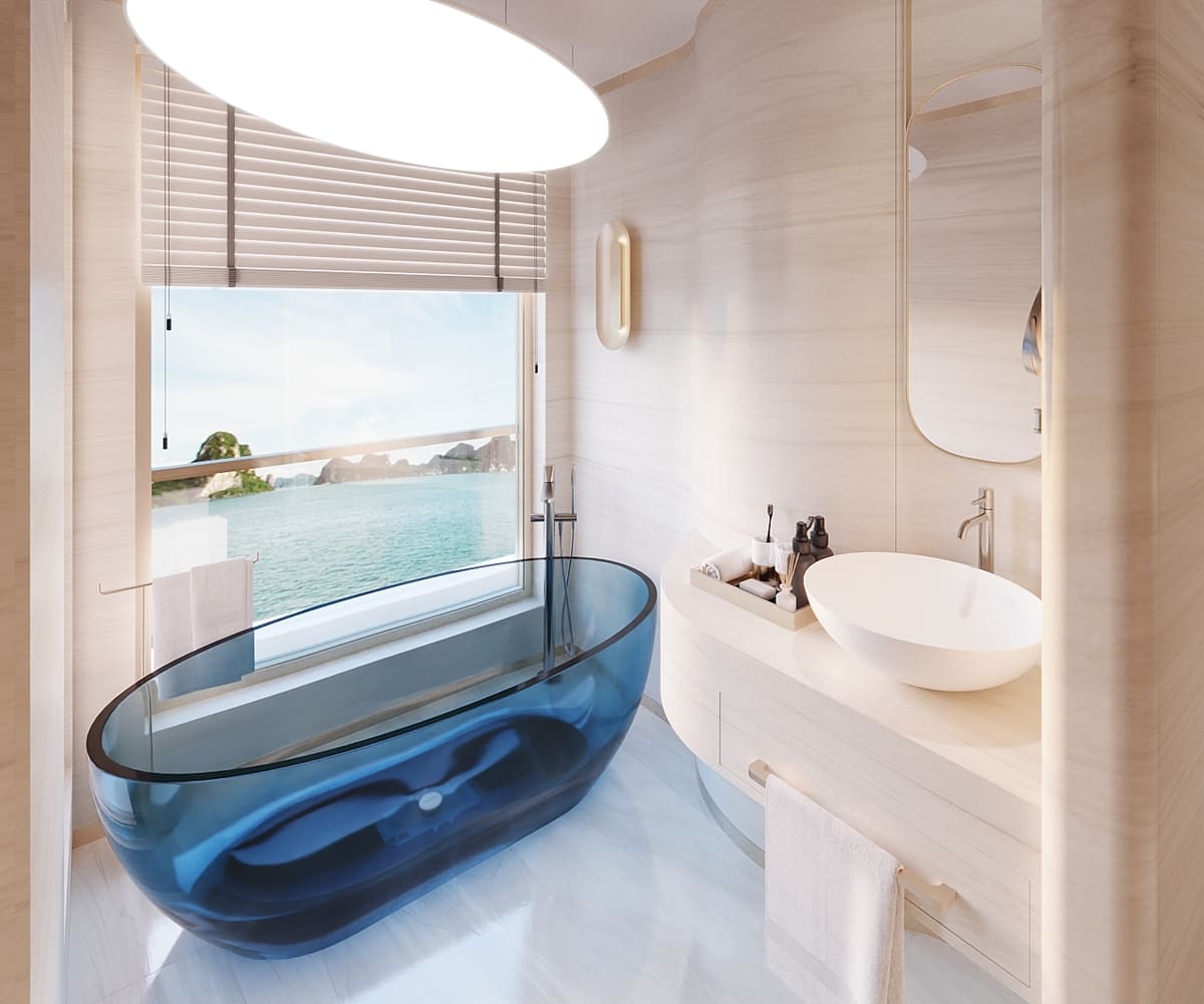 Athena Premium Cruise features 41 opulent suites, each meticulously designed to enhance onboard living. Every suite comes with a private full-glass balcony, providing uninterrupted panoramic views of Halong Bay’s iconic limestone formations. Interiors are equipped with high-end amenities, including luxurious bathtubs, separate standing showers, elegant dressing tables, and advanced soundproofing systems for ultimate privacy and relaxation. Selected suites elevate the experience further with private jacuzzi or onsen baths, personalized butler service, and exclusive premium facilities.