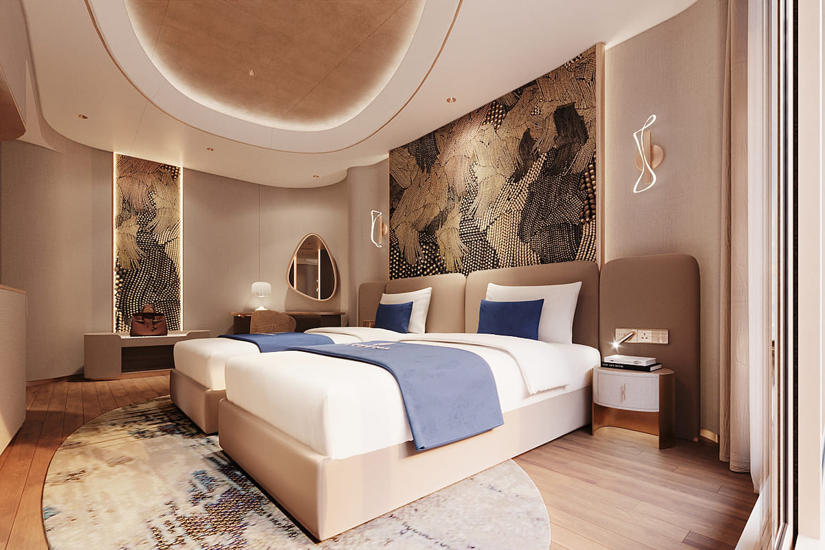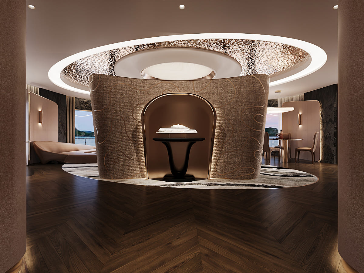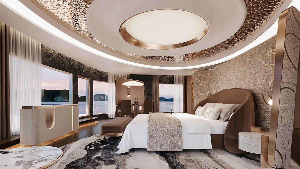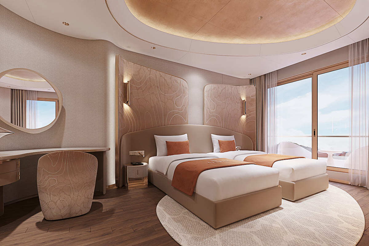 Beyond its luxurious accommodations, Athena Premium offers a world-class range of onboard amenities, delivering a truly multi-sensory journey. Guests can enjoy fine-dining restaurants, a stylish bar, a four-season swimming pool, a 3D golf simulator, onsen mineral baths, yoga and meditation spaces, sauna, and a sky observation lounge—ensuring every moment onboard is both relaxing and enriching.