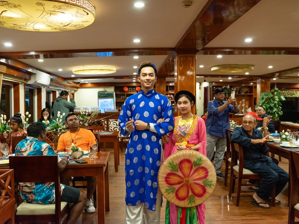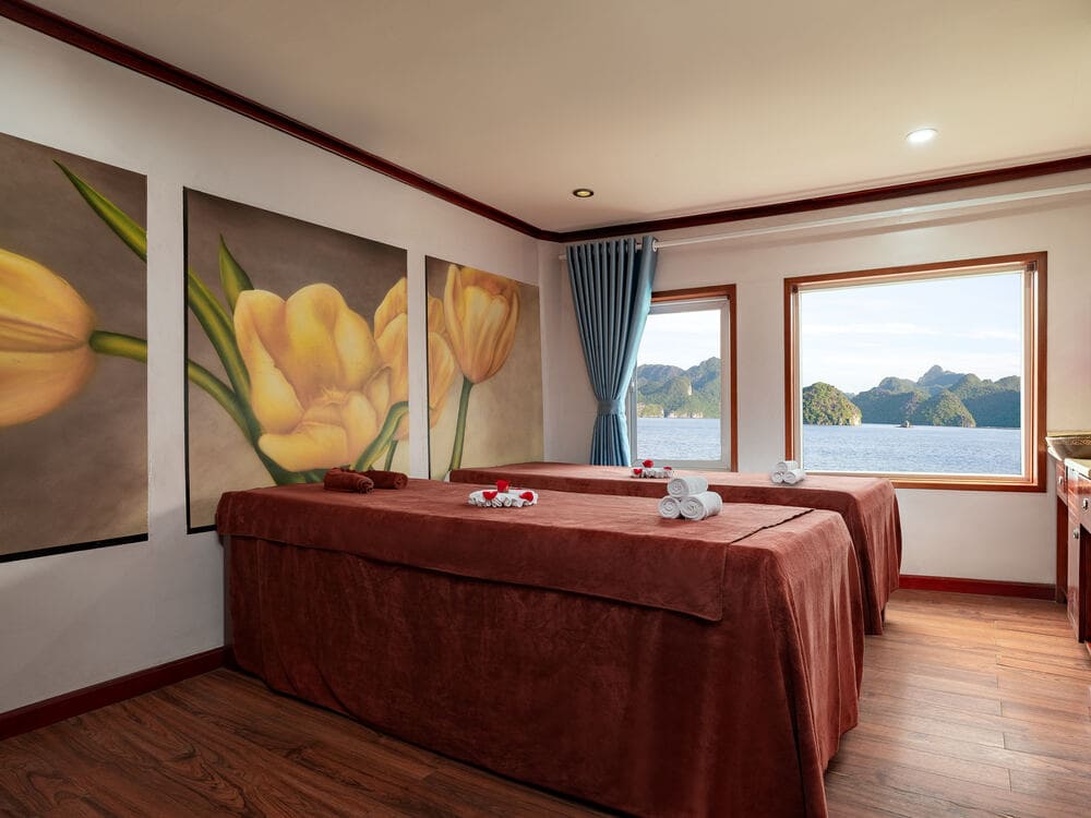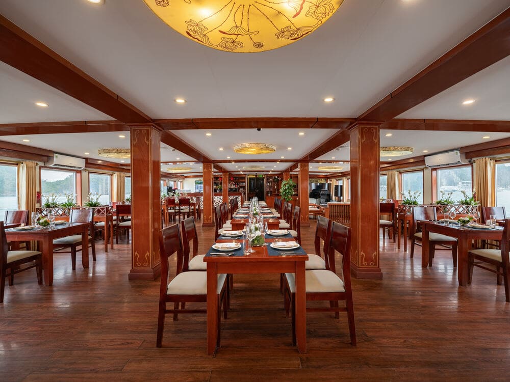 Onboard, guests can indulge in a diverse culinary experience at the elegant restaurant, serving a wide selection of Vietnamese specialties and fusion dishes, with vegetarian options available. After a day of exploration, unwind at the fully equipped spa or relax with a refreshing drink from the bar while watching the sunset over Halong Bay.