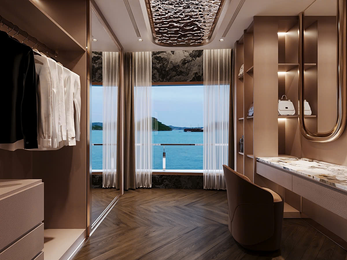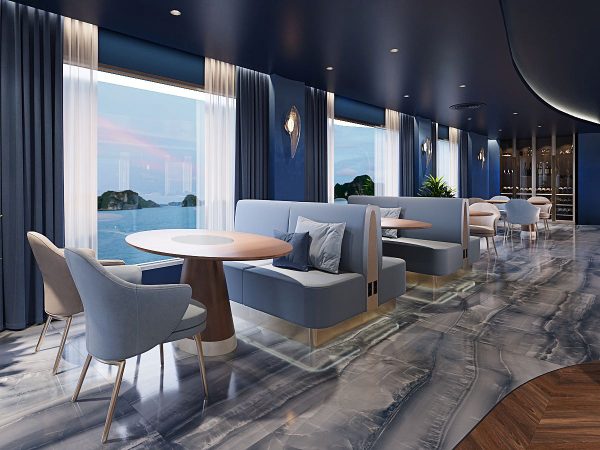 Athena Premium Cruise features 41 opulent suites, each meticulously designed to enhance onboard living. Every suite comes with a private full-glass balcony, providing uninterrupted panoramic views of Halong Bay’s iconic limestone formations. Interiors are equipped with high-end amenities, including luxurious bathtubs, separate standing showers, elegant dressing tables, and advanced soundproofing systems for ultimate privacy and relaxation. Selected suites elevate the experience further with private jacuzzi or onsen baths, personalized butler service, and exclusive premium facilities.