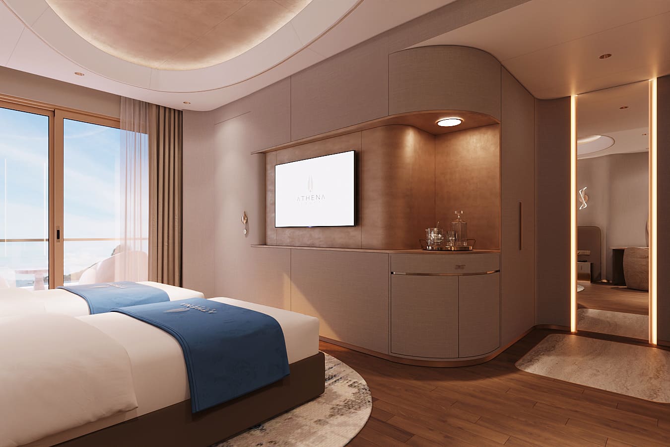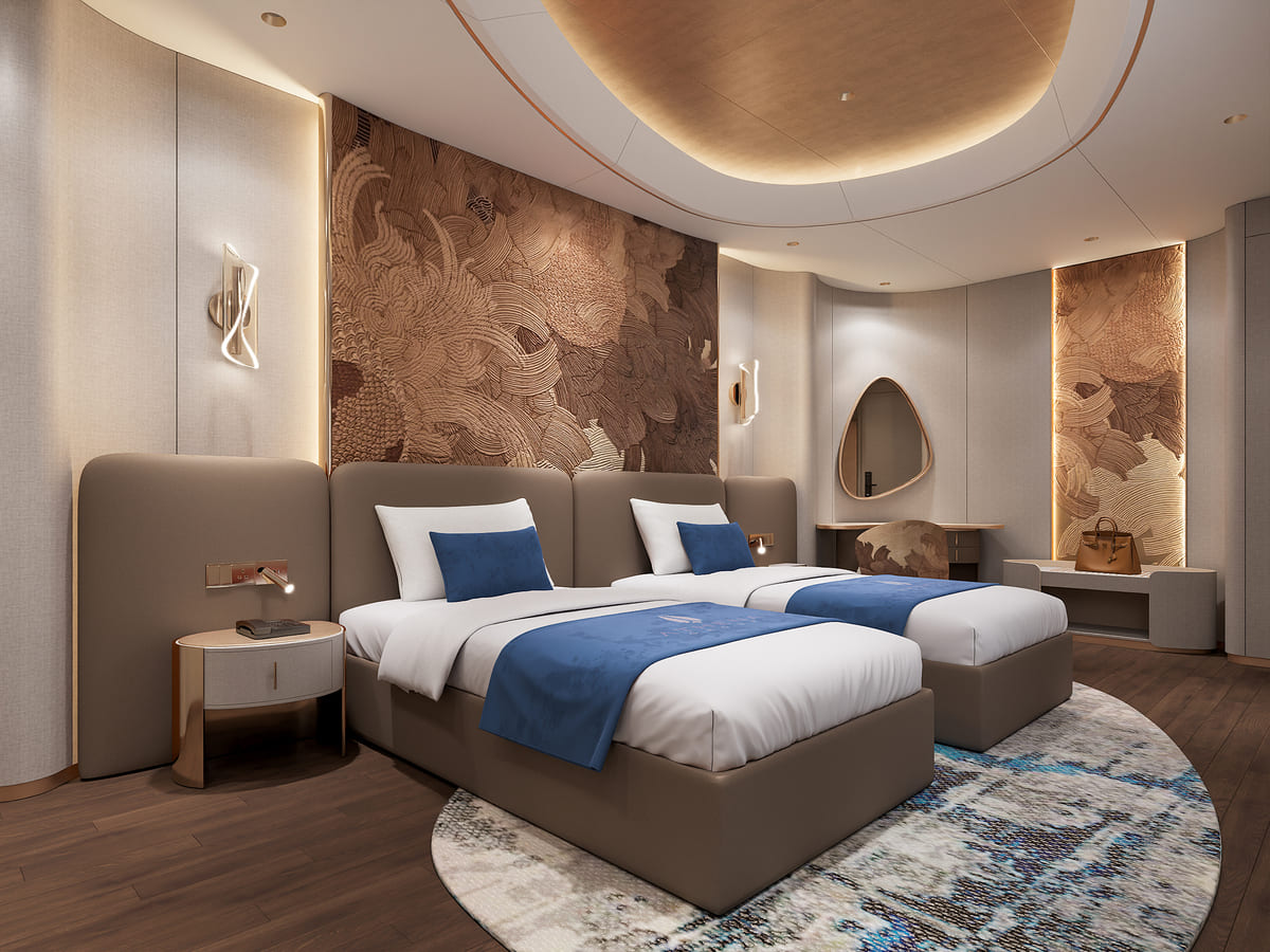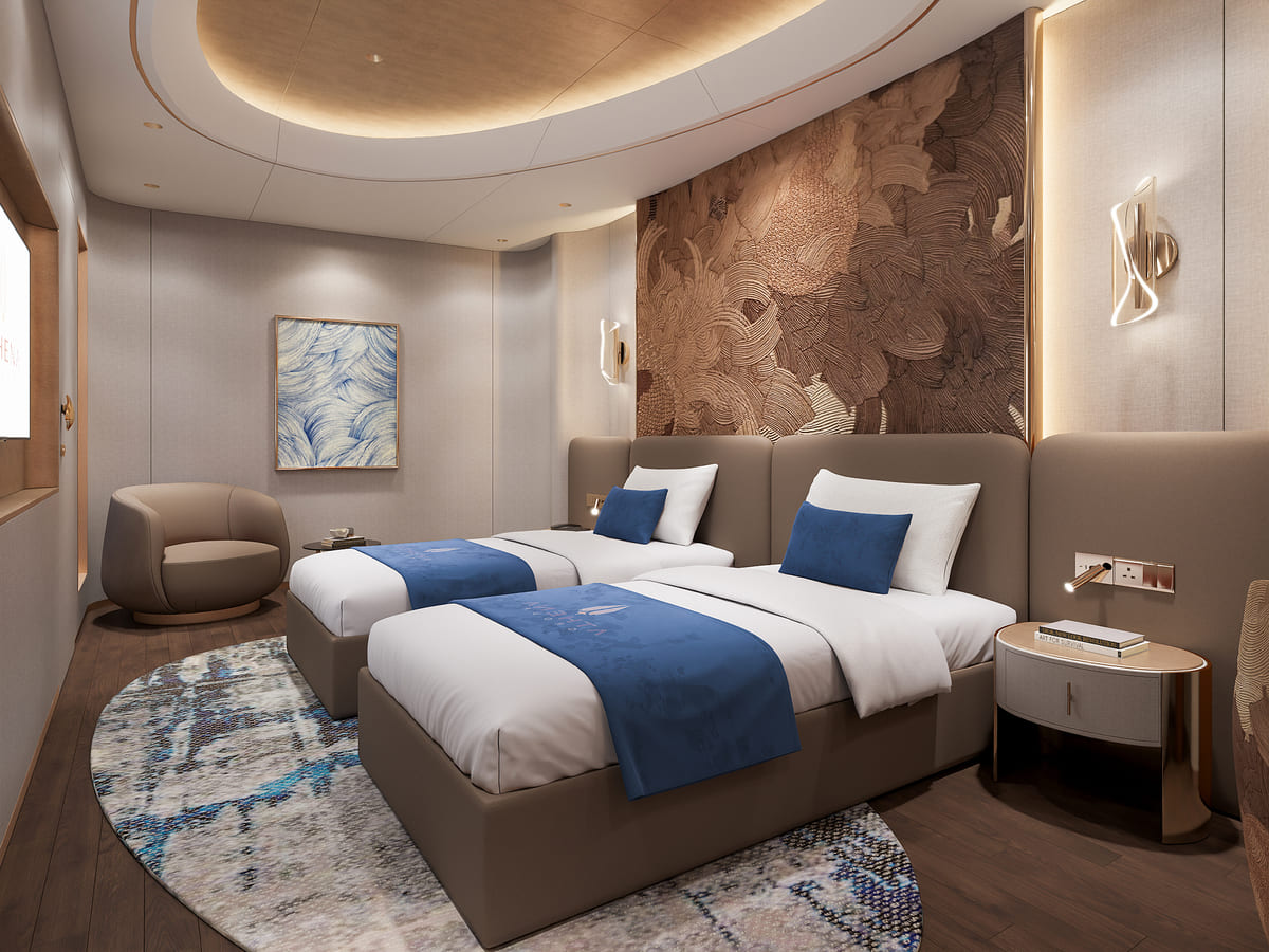Beyond its luxurious accommodations, Athena Premium offers a world-class range of onboard amenities, delivering a truly multi-sensory journey. Guests can enjoy fine-dining restaurants, a stylish bar, a four-season swimming pool, a 3D golf simulator, onsen mineral baths, yoga and meditation spaces, sauna, and a sky observation lounge—ensuring every moment onboard is both relaxing and enriching.