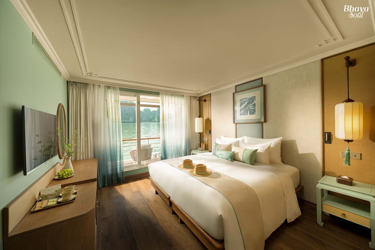 With only 20 spacious cabins ranging from 30m² to 80m², Bhaya Soul Cruise ensures ultimate privacy and comfort for every guest. The design is inspired by traditional Vietnamese ceramics, highlighted by a signature blue tone symbolizing the harmony between land, sea, and nature in Halong Bay. Each cabin is thoughtfully equipped with modern amenities such as air conditioning, TV, minibar, and Wi-Fi, delivering a perfect balance between sustainability and luxury living.