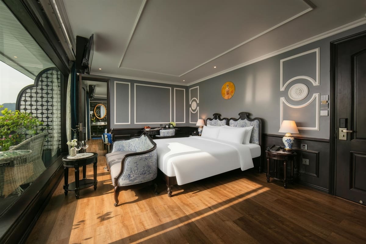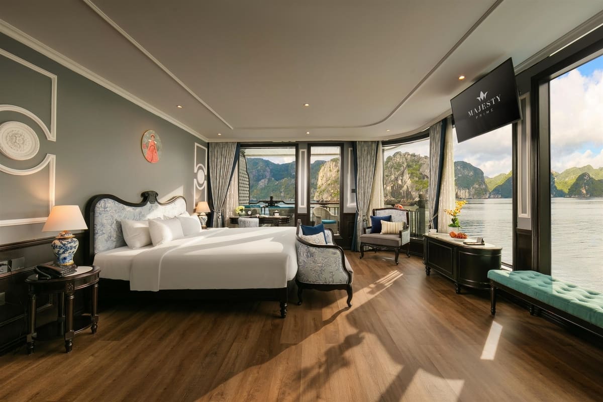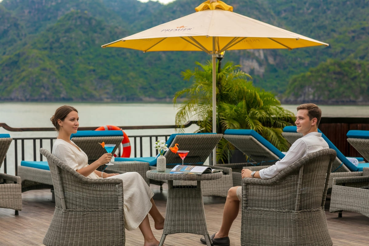 Afternoon Be ready on a small boat transfer to Majesty Prime Cruise. Upon boarding the main boat, you will be welcomed with complimentary drinks, have time to rest, and check into your room. Enjoy a hearty lunch in the restaurant before preparing for excursions to Lan Ha Bay. In the afternoon, you will be sitting on a bamboo boat rowed by the locals to visit the Dark and Light Cave and take in the beautiful surrounding scenery. Get ready for some relaxing activities under the sunset. You can swim in the swimming pool or Jacuzzi, unwind on the sundeck, or enjoy a massage. Join the sunset party in the bar area, savoring drinks and snacks. The boat will settle for the night at the Tra Bau area.